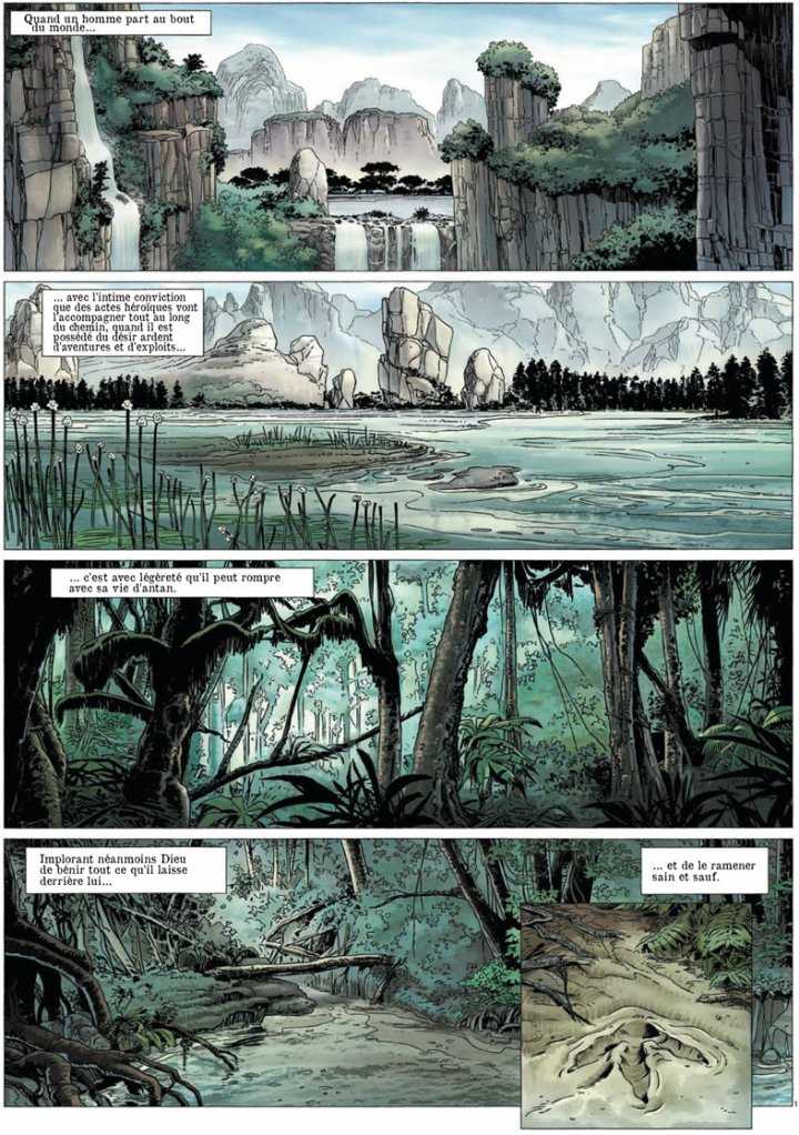 J'imagine que comme tous les gamins (petits et grands), les dinosaures ont toujours intrigué ou émerveillé, comme le confirment les succès des films Jurassick Parc ou des nombreux films d'animations sur le sujet. Je n'avais pas encore eu l'occasion de lire des BD dans ce domaine, je rattrape donc mes lacunes avec cette trilogie du Monde perdu, tirée du célèbre roman du début du siècle dernier. Nous découvrons le personnage central, le professeur Challenger, qui va faire ses premières armes dans ce Monde perdu, mais qu'on retrouvera ensuite dans 4 autres romans d'Arthur Conan Doyle. Personnage qui a tout de l'anti-héros puisqu'avec son caractère grossier et vaniteux il est loin d'être sympathique. Le véritable héros est plus discret, dans l'ombre, c'est le reporter Ned Malone qui raconte l'histoire. Je ne vais pas vous narrer une aventure bien connue, mais nous suivrons l'épopée de ces 5 explorateurs à la recherche de ce monde préhistorique en Amérique du sud. Le premier tome conte l'expédition jusqu'à l'arrivée sur le haut plateau censé abriter l'ancien monde. Concernant la BD, l'histoire est bien racontée, bien rythmée et agréable à lire. Les images sont aussi de très bonne facture, même si comme toujours j'ai une certaine difficulté à apprécier les dessins réalisés sur ordinateur et imprimés sur papier glacé. L'ensemble est trop lissé, manque de chaleur, de personnalité, les traits de crayons sont trop nets, les textures trop uniformes. Et les visages manquent d'expression, hormis les yeux ouverts ou surtout un peu trop fermés à mon goût, ils sont extrêmement rigides, ce qui peut nuire à la cohérence entre le texte et le visuel puisqu'il n'y a pas de différence entre un faciès énervé ou joyeux. Ceci étant, quand on passe au dessus de ces détails, l'intrigue et la qualité des décors vous embarquent sans difficulté dans l'aventure. Je vais donc me procurer les 2 tomes suivants pour découvrir ce fameux monde perdu.