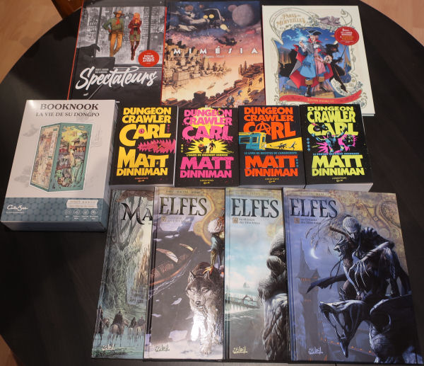 Houlà il ne faut jamais faire un tour chez Cultura, c'est l'assurance de repartir les poches pleines ! - Un book Nook original avec un décor de montagne du Japon - Les 4 volumes de Dungeon Crawler Carl car j'ai dévoré le premier emprunté à la médiathèque, mais il mérite d'être dans ma bibliothèque - Les volumes 5, 6 et 7 des Elfes, et très mal rangé avec eux, le volume 8 ... des mages alors que je pensais prendre celui des Elfes. Bon ce n'est pas perdu c'était la collection que je comptais entamer ensuite.