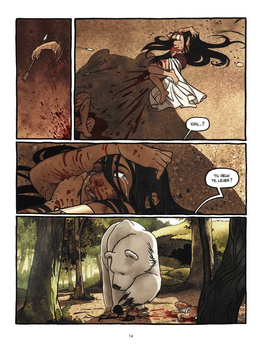 Quelle surprenante BD ! Je dois dire que j'ai été surpris et charmé à la fois par l'histoire et par les visuels. Le dessin est assez simple, dans le style cartoon avec les contours des personnages très marqués au trait noir. Les décors peuvent eux fourmiller de petits détails. L'ensemble est bourré de charme, comme dans un vieux Disney, car les traits sont doux et arrondis, et les animaux sont tendres et pacifiques. On s'attache donc très vite à tout ce monde, surtout quand on constate à quel point, à la différence des humains, ces animaux sont généreux et empathiques. Nous suivrons donc l'aventure de cette adolescente, sauvée du sacrifice par le roi ours, qui lui propose le mariage pour la prendre sous sa patte, le tout sous le regard attendri et bienveillant de la mère des singes qui se charge de son éducation. L'intrigue tourne autour du caïman qui souhaite réparation pour son sacrifice non obtenu, et qui va finalement tourner la tête de la gamine pour une vengeance sanglante, malgré force conseils d'apaisements de la mère singe. J'ai beaucoup aimé ces échanges humaine animaux, la grande sagesse de ces derniers, ainsi que l'amour qui lie Xipil et son amant ours particulièrement bien rendu et poignant. Je regrette uniquement la fin, que je trouve abrupte, expéditive. J'aurais tant apprécié que la gamine gagne en maturité plutôt que rester une ado boudeuse et revancharde, et surtout je m'attendais à une lueur d'espoir, qui ne viendra pas. Cette BD à la fois enchanteresse (la magie des animaux qui parle) et dure (sanglante et adulte) mérite la découverte.